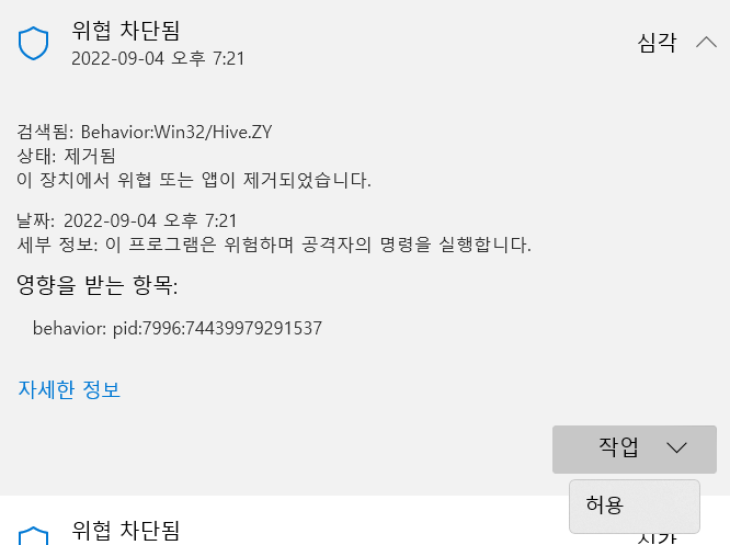 2022년 9월 4일, 레딧이나 클리앙을 비롯한 국내외 커뮤니티에서 Windows Defender가 'Behavior:Win32/Hive.ZY' 탐지명으로 바이러스 검출 안내를 반복적으로 띄운다는 소식을 접해 관련 사항에 대해 급히 정리해드립니다.