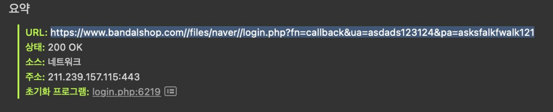 login.php (네이버 로그인 피싱)에는 입력된 ID와 PW를 공격자에게 보내는 기능이 포함되어 있는 것으로 추정됩니다. 매개변수로 ua에는 입력된 ID를, pa에는 입력된 패스워드를 담아 GET 요청을 보냅니다.
