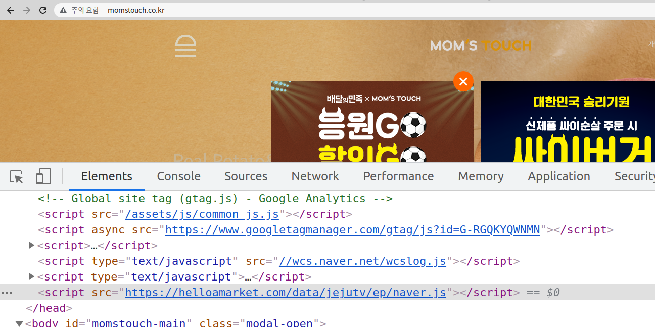 다시 맘스터치 사이트로 돌아가보겠습니다. 맘스터치 사이트를 보면 우선 helloamarket.com에 저장된 'naver.js' 스크립트 파일을 호출합니다.