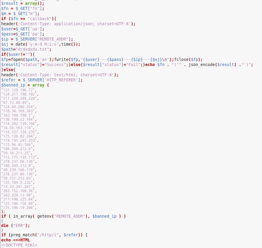 사진과 같이 Banned_ip라 하여, ID와 PW 값에 고의적으로 쓰레기 값을 넣는 IP를 차단하는 모습도 확인할 수 있습니다. 그 외에도 login.php가 저장된 디렉터리 내 drdxdxds.txt에 사용자가 입력한 ID와 PW, IP, 시간을 기록하는 것을 볼 수 있습니다.