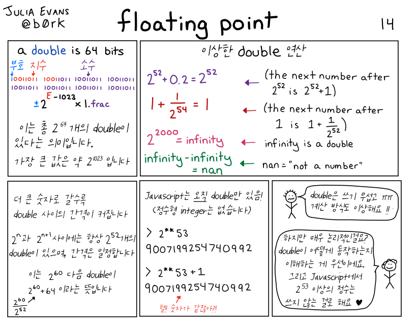 이 글에서는 부동 소수점이 어떻게 작동하는지에 대해서는 길게 설명하지는 않을 예정입니다. 대신 제가 몇 년 전에 작성한 일러스트에서 부동 소수점의 기본 개념을 다루고 있으니 참고해 주세요.
