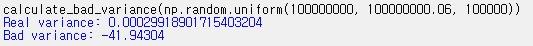 단일 패스로 분산을 계산할 수 있는 간단한, 하지만 매우 잘못된 알고리즘이 있습니다. 이는 한 블로그 포스트에서 소개된 방법입니다. 아래는 해당 알고리즘으로 구현한 Python 코드입니다: