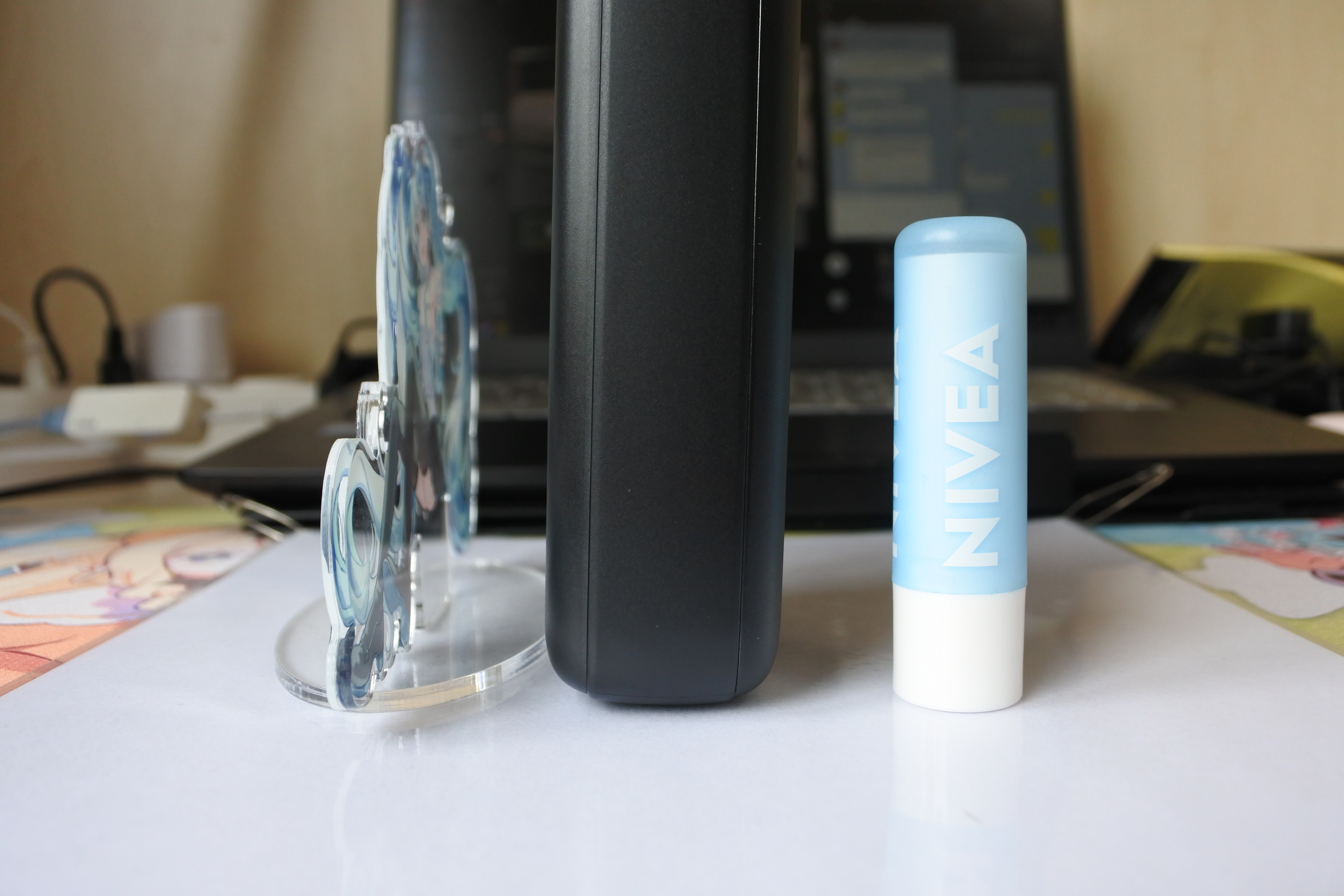 두께 체감에 도움이 될까 싶어 립밤과 아크릴 스탠드를 나란히 뒀습니다.