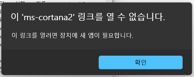 사진처럼 「이 'ms-cortana2' 링크를 열 수 없습니다.」, 「이 링크를 열려면 장치에 새 앱이 필요합니다.」 오류가 발생합니다.